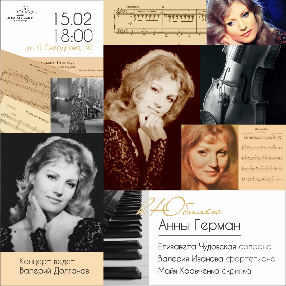 К 90-летнему юбилею со дня рождения Анны Герман Дом музыки представляет программу, посвященную «белокурому ангелу польской эстрады». Песни из репертуара Герман во вдохновенном ансамбле сопрано, фортепиано и скрипки воскресят в памяти голос и образ музыкальной Легенды, согреют публику и обнимут теплом!