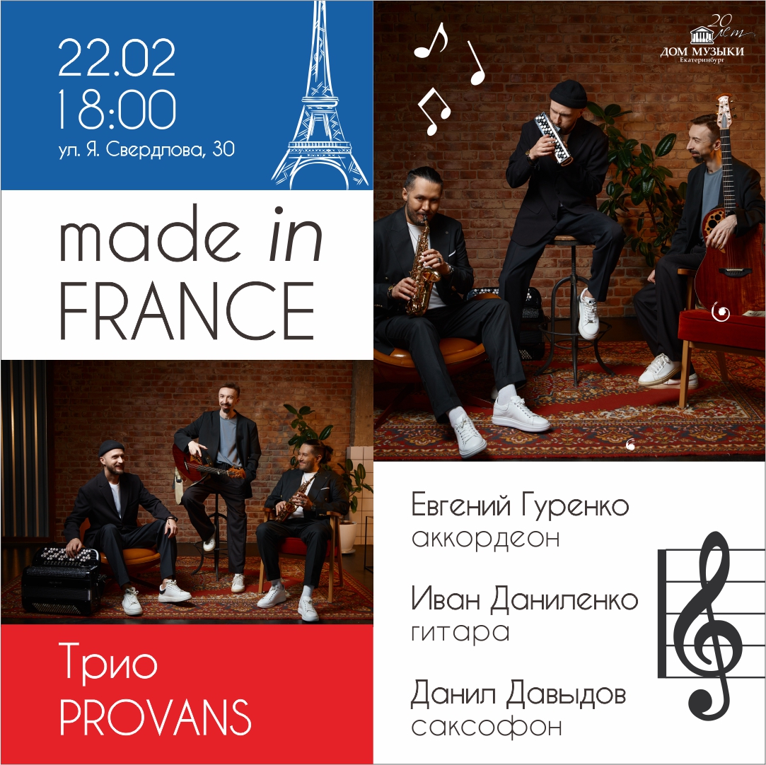 В продолжение традиционного цикла программ, посвященных стране элегантного шарма, Трио PROVANS представляет новую программу, целиком состоящую из музыки французских авторов. Вдохновившись творчеством Р. Гальяно, Дж. Косма, М. Леграна, Яна Тирсена, музыканты представят их лучшие сочинения в своих фирменных аранжировках. Традиционно прозвучит музыка в стилях: новый мюзет, джаз-мануш, танго нуэво, свинг и др.