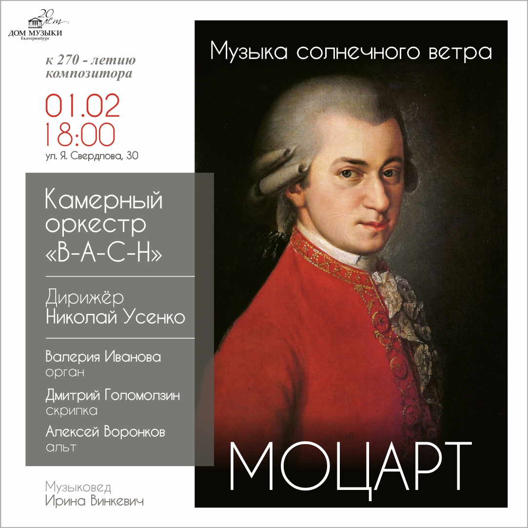 К 270-летию со дня рождения Вольфганга Амадея Моцарта камерный оркестр подготовил программу, целиком посвященную австрийскому гению. Русский композитор Антон Рубинштейн воспел высказыванием солнечную природу этого композитора. Как о божественном Гелиосе, «высшей точке красоты» на музыкальном небосводе и вечной гармонии, отзывались об искусстве Моцарта композиторы: П. Чайковский, С. Прокофьев, Д. Шостакович…