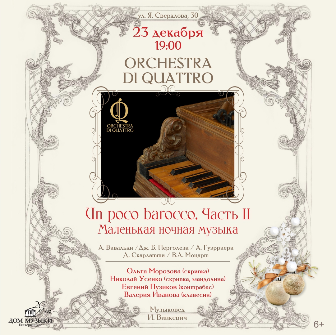 На сей раз большое путешествие маленького оркестра проложит свой путь от блистательных жемчужин рассвета итальянского барокко к «ночным вершинам» великого венского классицизма. Воссоздать звучащую гармонию этих «пейзажей сердца и разума» музыкантам помогут известные и менее знакомые имена: А. Вивальди, Дж. Б. Перголези, М. Учеллини, Р. Валентайна, А. Гуэрриери, Д. Скарлатти и В.А. Моцарта.